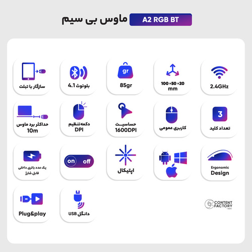 ماوس بی سیم مدل A2 RGB BT یکی از محصولات مقرون به صرفه و مدرن برند YINDIAO است. این ماوس از طریق دانگل USB بلوتوثی به انواع سیستمهای هوشمند مانند رایانه و تبلت که مجهز به پورت USB هستند، متصل میشود. همچنین این محصول قابلیت اتصال از طریق وای فای را هم دارد. ماوس مذکور تا فاصله 10 متری قابلیت اتصال به سیستمهای هوشمند را دارد که این برد یک برد استاندارد بوده و اغلب کاربران نیازی به فاصله بیشتر از این ندارند. ماوس فوق با حسگر اپتیکال مدرن کار میکند و با بهرهگیری از این فناوری حرکات بسیار نرم و روانی بدون استفاده از ماوس پد را دارد. از دیگر قابلیتهای این ماوس بیسیم این است که دارای باتری لیتیومی قابل شارژ بوده که این باتری از طریق کابل 30 سانتیمتری در مدت زمانی حدود یک تا دو ساعت شارژ میشود. این ماوس 4 کلید برای هدایت ماوس و دو کلید روشن _ خاموش هم دارد. این ماوس بی سیم در محدوده دقت بین 800 تا 1600 طراحی شده که این میزان دقت برای انجام کارهای روزمره بسیار ایدهآل است. ماوس بی سیم مدل A2 RGB BT علاوه بر قابلیتهای مذکور دارای فناوری RGB بوده که با استفاده از این فناوری میتوان رنگ نور ماوس را تغییر داد و حتی آن را به حالت رنگینکمانی تغییر دهید و فضای کار خود را زیباتر کنید. این ماوس همچنین دارای طراحی ارگونومیک هم بوده و بسیار خوشدست و سبک است و کاربران میتوانند در ساعات طولانی بدون احساس درد و خستگی در ناحیه دست با آن فعالیتهای خود را انجام دهند. ماوس مذکور با اینکه قابلیتهای فراوانی دارد، اما با قیمت بسیار مقرون به صرفهای عرضه میشود و یک گزینه ایدهال برای دانشجویان، کارمندان اداری و فریلنسرهاست.